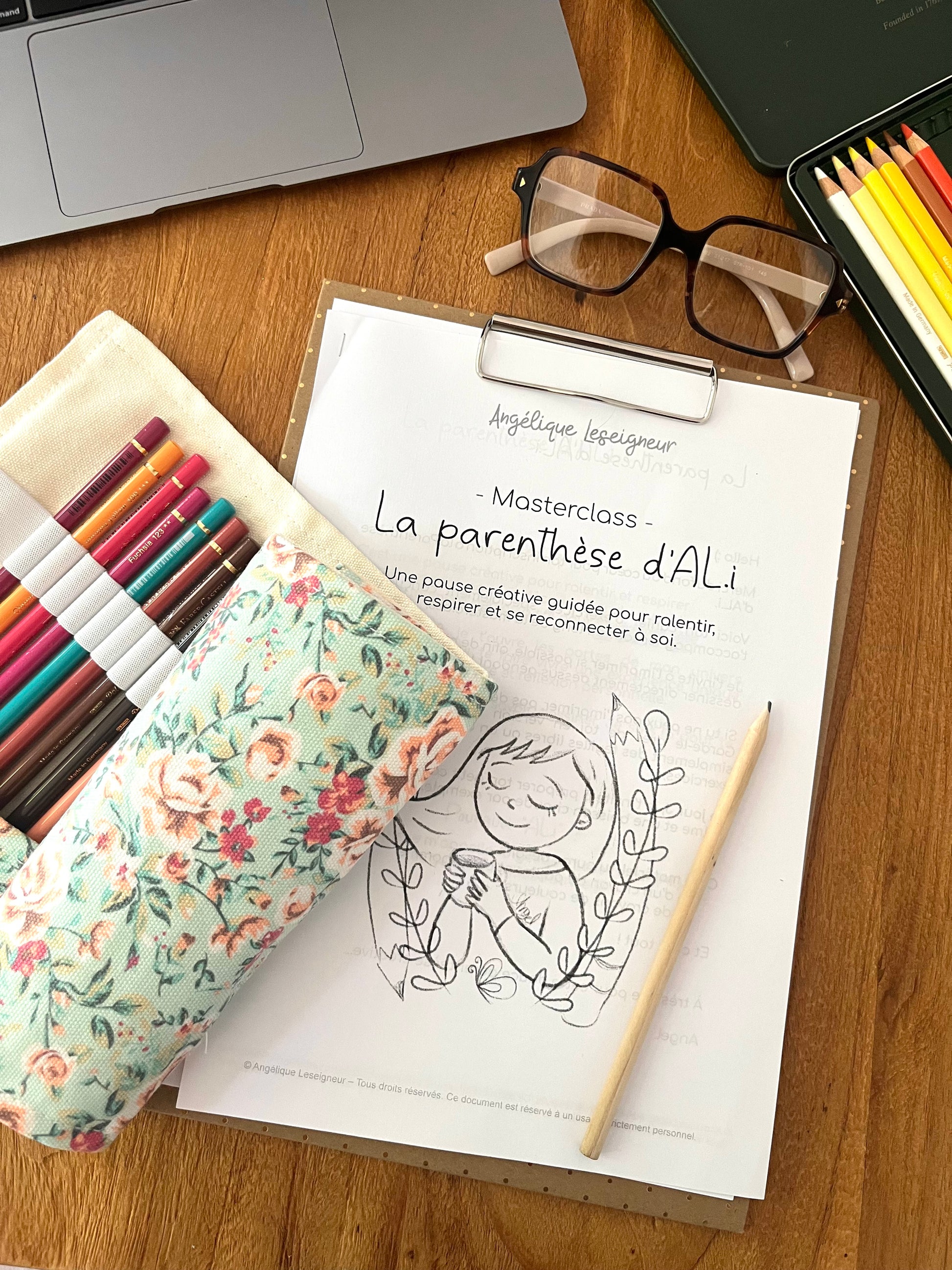- Un cahier d’exercices (format PDF), à imprimer chez vous, pour écrire et dessiner pendant cette pause créative rien que vous.